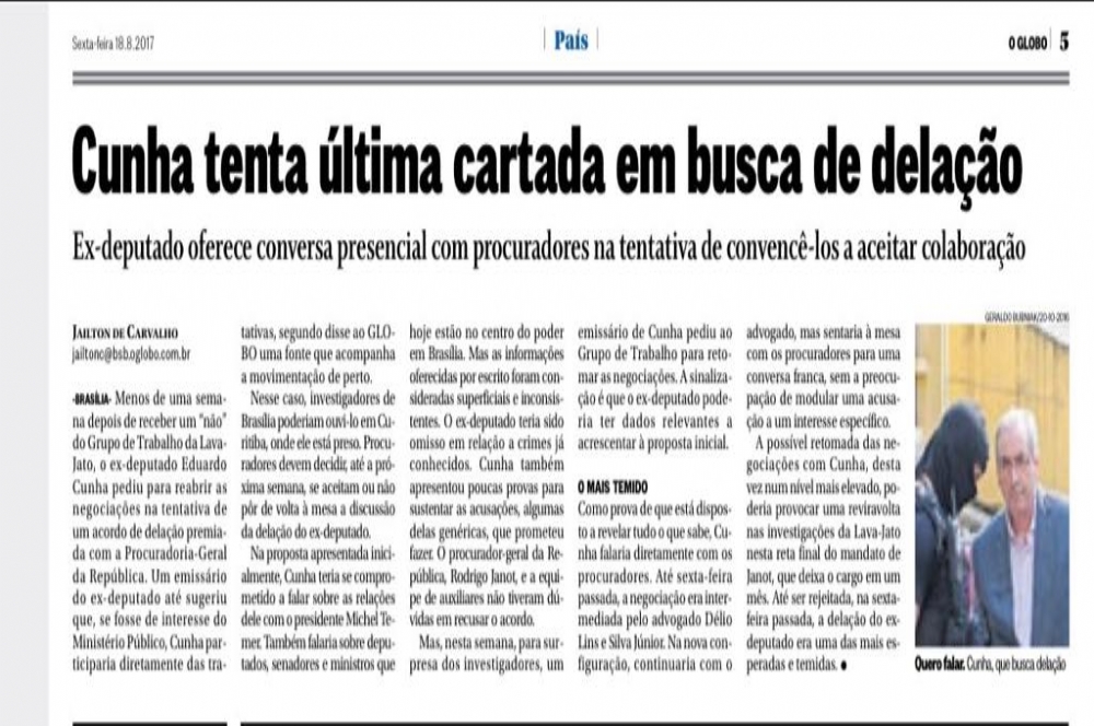Cunha, enfim, se oferece ao MPF para delação O ex-presidente da Câmara Eduardo Cunha se oferece ao MPF para fazer delação para dizer tudo o que sabe sobre Temer, e sobre deputados e senadores que foram financiados com o dinheiro da corrupção (notícia de O Globo). Cunha se ofereceu uma semana depois de receber um “não” do grupo de trabalho da Lava Jato.