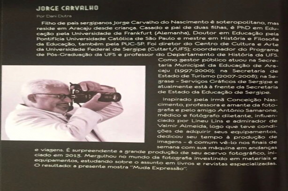 Inspiração No livro, a diretora Dani Dutra relata: “Jorge Carvalho foi inspirado pela irmã Conceição Nascimento, professora e amante da fotografia e pelo amigo Antônio Samarone,médico e fotografo diletante, influenciado por Lineu Lins e admirador de Valmir Almeida, logo que teve condições de adquirir seus equipamentos, dedicou seu tempo à produção de imagens é comum vê-lo nos finais de semana com sua máquina em andanças e viagens. E surpreendente a grande produção do seu acervo fotográfico, iniciado em 2013. Mergulhou no mundo da fotografia investindo em materiais e equipamentos, estudando sobre o assunto em livros e revistas especializadas. O resultado: a presente mostra “Muda Expressão”.