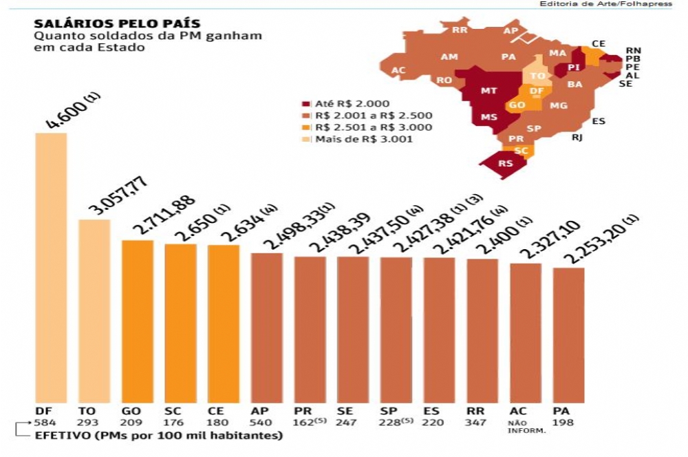 (FSP, domingo, 12): Os menores salários pagos pelos governos dos Estados da Bahia e do Rio de Janeiro aos seus policiais militares estão dentro da média do país.