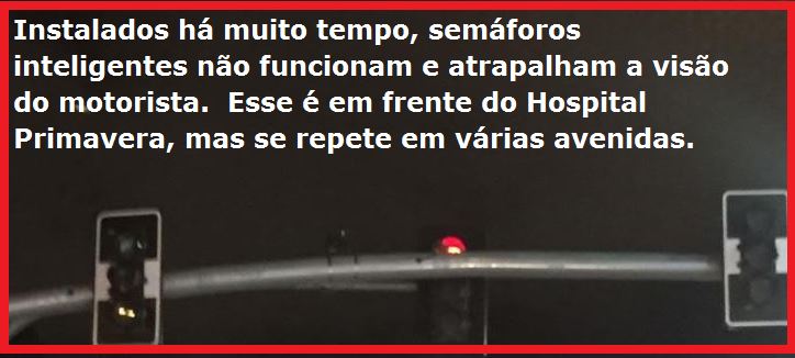 Este da foto é em frente ao Hospital Primavera. Como o leitor pode notar, os novos semáforos que não estão funcionando na frente prejudica a visão do motorista para o antigo, vendo apenas uma parte da sinalização.