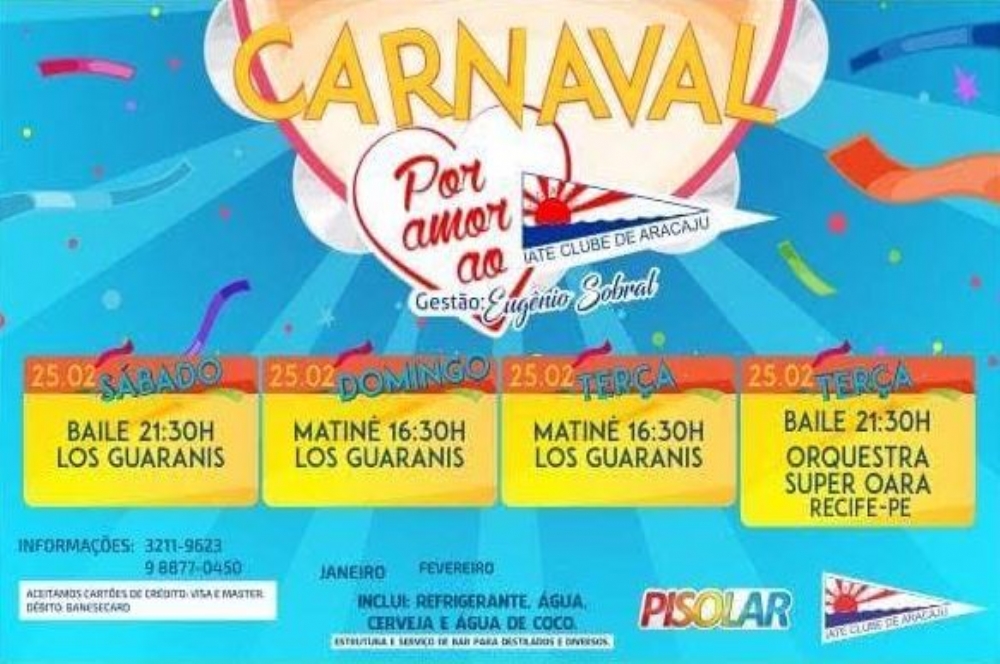 Momo e realiza o Carnaval Por Amor ao Iate. Com dois bailes infantis, que acontecerão no domingo, 26 e terça, 28, a partir das 16:30, ao som da banda Los Guaranis. Os adultos também vão curtir e se divertir com um baile no sábado, 25, a partir das 21:30, embalados pela banda Los Guaranis e outro na terça, também às 21:30, com a Orquestra pernambucana Super Oara, que aporta no salão nobre do clube com muito astral e alegria. Vista sua fantasia, reúna os amigos e aproveite o melhor carnaval de Sergipe. O primeiro lote encerra dia 12 de fevereiro com preços especiais para as mesas que já estão à venda na secretaria do Iate, e podem ser adquiridas no cartão de crédito Visa e Master e Banese débito. Garanta a sua, porque vai ser bom demais. Informações pelos fones 3211-9623 e 98877-0450.