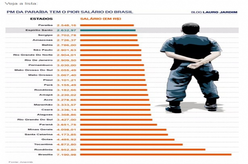 dos policiais militares no país. O Espírito Santo, que vivenciou o caos com a greve de policias, é o penúltimo na lista, com salário superior apenas ao da Paraíba. O melhor salário do Brasil é do policial militar de Brasília, onde o piso inicial é de R$ 7,1 mil. Pelo quadro ao lado, Sergipe é o antepenúltimo da lista, com R$ 2,702, 78 no início da carreira.