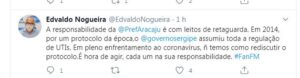 É lamentável Edvaldo citar um protocolo de 2014 quando ninguém previa uma pandemia. É algo imprevisto, uma pandemia, cada um tem que fazer a sua parte. Por isso os gestores estão liberados para contratar emergencialmente.