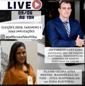 Eleições 2020, fake news e suas implicações. Este é o tema da live que será realizada hoje, 09, às 19h, com a participação do presidente da Comissão de direito eleitoral da OAB/SE e especialista em direito eleitoral, Jefferson Carvalho e a magistrada do TJSE e mestre em direito, Eliane Celina Afra, juíza da 31ª Zona Eleitoral.
