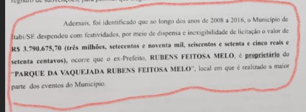 R$ 3,7 milhões com festas No processo judicial Processo 201769100081, com vários réus, o ex-prefeito Rubens Feitosa é acusado de dispensa de licitações no valor de cerca de R$ 6 milhões, para consultorias jurídicas e em outras áreas, locações de veículos (máquinas e imóveis). Foram feitas também doações e contribuição no valor de R$ 346 mil para moradores de outro município em período eleitoral. A denúncia do MPE envolve também as festas de 2008 a 2016, com gastos de R$ 3.790.675,70 sem licitação para festas no Parque de Vaquejada que pertence ao ex-prefeito Rubens (prefeito à época).
