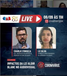 Live hoje, 08/09, às 11h Impactos da Lei Aldir Blanc no áudiovisual Os impactos da Lei Aldir Blanc no audiovisual é o tema da vez em mais uma #oabselive, e será tratado por: Charlie Fonseca, Vice-presidente da Comissão de Promoção Cultura; e Lu Silva, membro do fórum permanente do audiovisual de Sergipe. Hoje, 08,a partir das 11h. Contamos com a sua audiência e participação: https://www.instagram.com/oabsergipe/