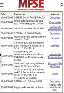 para apurar indícios de cargos em comissão fantasmas na Assembleia Legislativa de Sergipe. Em março foi aberto o procedimento de “notícia do fato” e em abril encaminhado ofício ao presidente da ALESE, Luciano Bispo. Como o mesmo fez desdém e não respondeu a “notícia do fato” foi transformada em inquérito civil em julho.