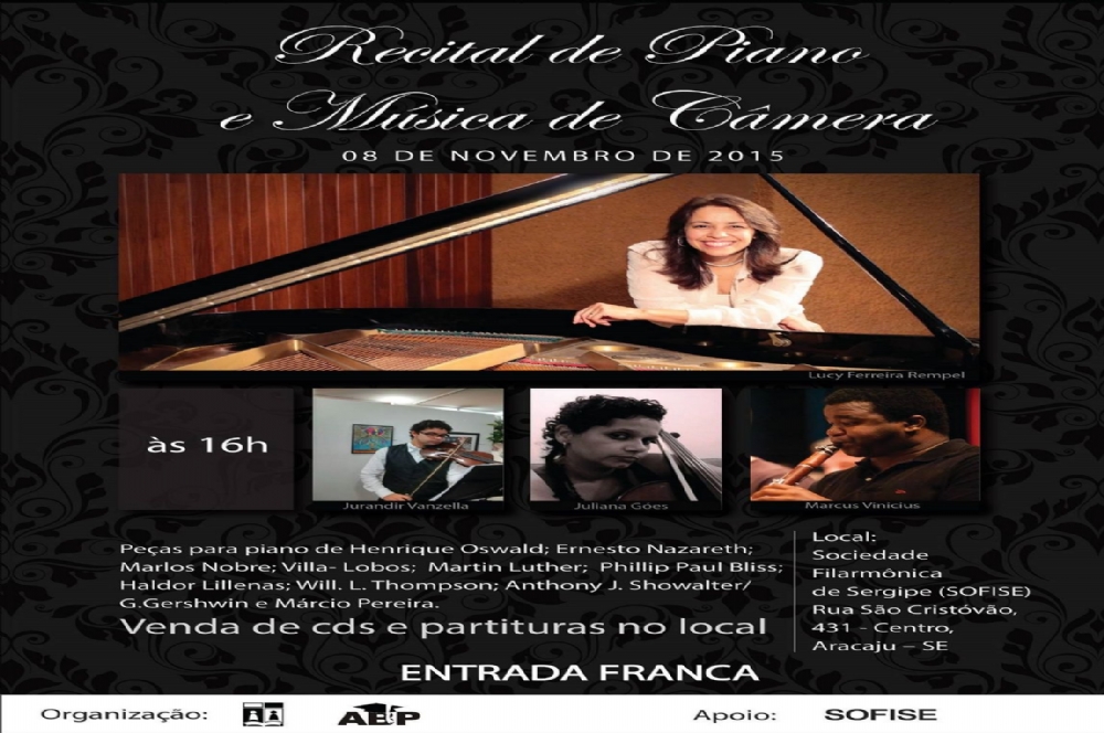 No dia 08, domingo, acontecerá o Recital de Piano e Música de Câmara que receberá a pianista carioca Lucy Rempel. Lucy é musicista, concertista, arranjadora, professora, mestre em Piano pela Universidade Federal do Rio de Janeiro. Lecionou nos Estados Unidos e na Austrália. Lançou 04 livros de arranjos para piano de cânticos e hinos evangélicos em estilo clássico e, além da realização de uma turnê pelo sul do Brasil tem tocado em igrejas de diversas cidades brasileiras. Lucy estará acompanhada de Juliana Góes, violoncelista, Jurandir Vanzella, violinista, e Marcos Vinícius, multi-instrumentista. Serão executadas peças ao piano de Heitor Villa-Lobos, Ernesto Nazareth, Henrique Osval, Marlos Nobre, Martinho Lutero, Philip Paul. Bliss, George Gershwin, Anthony J. Showalter, Márcio Pereira e Haldor Lillenas. A apresentação acontecerá às 16h na Sociedade Filarmônica de Sergipe – SOFISE, Rua São Cristóvão 431 em Aracaju.