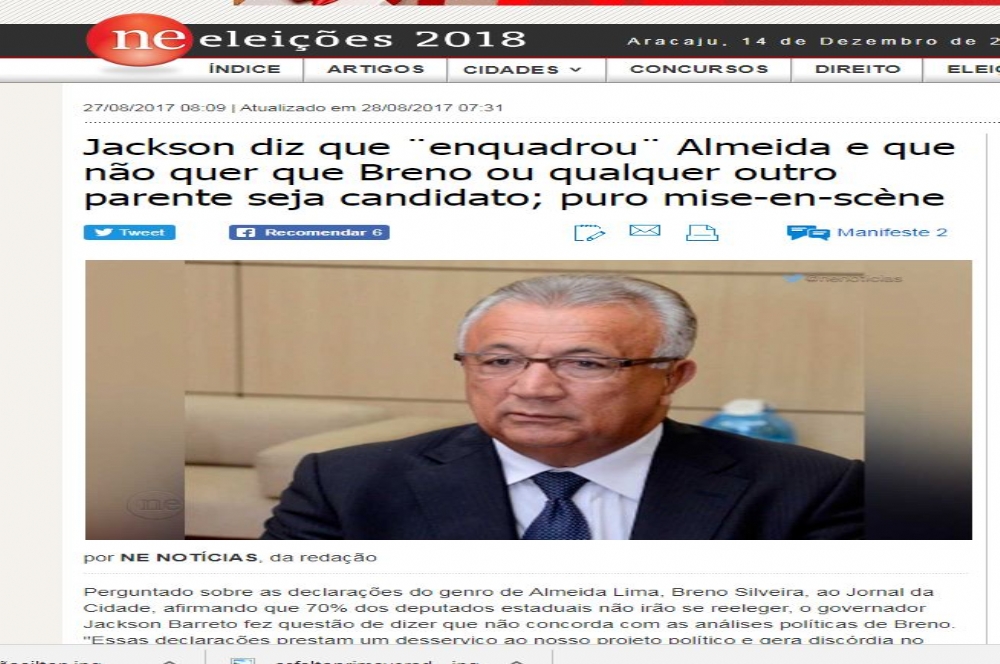 Em agosto deste ano, ao conceder entrevista ao Jornal da Cidade, Jackson Barreto anunciou que tinha “enquadrado” Almeida e que não queria nem Breno nem qualquer outro parente candidato. Pelo visto que foi enquadrado e posto no lugar de mero espectador foi o governador.