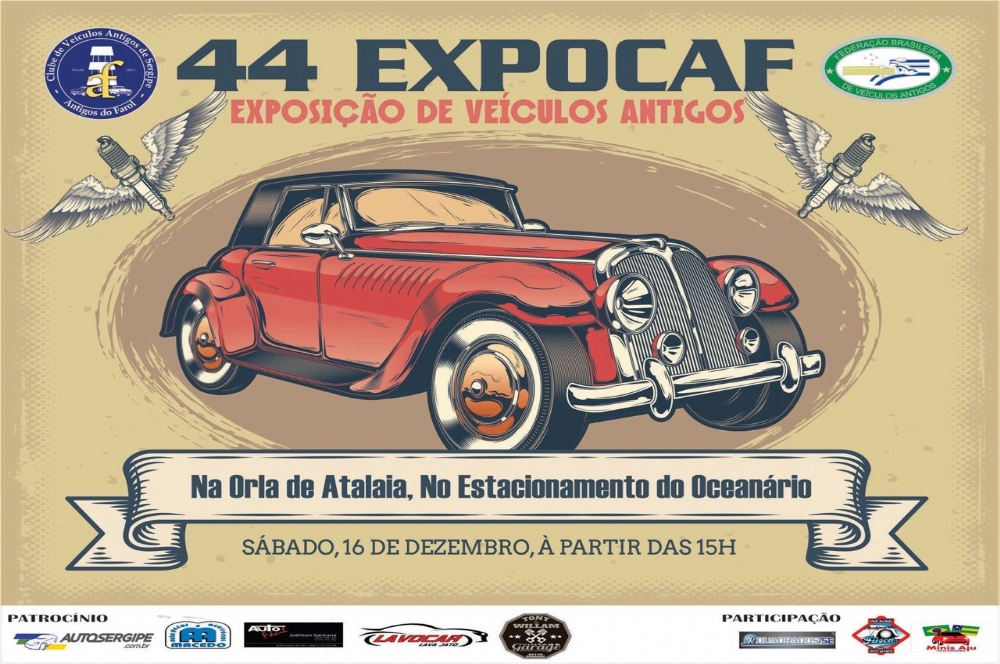 44ª Exposição Amanhã, 16, no estacionamento do Oceanário na Orla de Atalaia, em Aracaju, será realizada a 44ª Exposição de Veículos Antigos – Expocaf. A exposição começa às 15h. O evento é mais uma realização do Clube de Veículos Antigos de Sergipe – Amigos do Farol e da Federação Brasileira de Veículos Antigos.
