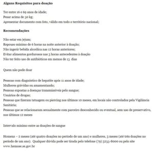 Importância A assistente social, Marjana Fontoura Almeida, ressaltou a importância da iniciativa e destacou que a Alese já encaminhou dois grupos, totalizando 15 doadores, e que tem uma lista de interessados a doar. “Incentivar a doação em um espaço que trabalham muitas pessoas e a maioria nunca doou é importante. Estamos organizado uma logística em dias alternados para contemplar mais pessoas, pois o estoque de sangue está 50% mais baixo, agora, na pandemia”, destacou. Marjana Fontoura Almeida, enfatizou que a ideia da doação surgiu em virtude do Dia Mundial do Doador de Sangue, comemorado no último dia 14 de junho, e que a campanha de doação de sangue, segue por tempo indeterminado. Leia os requisitos e recomendações no print ao lado. Mais informações: www.hemose.se.gov.br