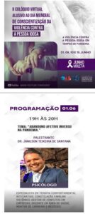 Nos dias 01, 08, 10 e 15 de junho realizaremos o II Colóquio Virtual Alusivo ao Dia Mundial de Conscientização da Violência Contra a Pessoa Idosa, e você é nosso convidado especial para este evento. Totalmente online e gratuito com transmissão ao vivo em todas as datas a partir das 19h em nosso canal – www.youtube.com/oabse.
