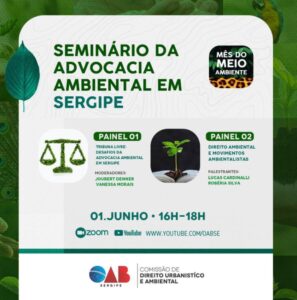 Celebrando a semana do meio ambiente, a OAB/SE, através da Comissão de Direito Urbanístico e Ambiental, tem o orgulho de promover no dia 01/06 a partir das 16h o Seminário da Advocacia Ambiental em Sergipe. Evento gratuito e com transmissão ao vivo através do nosso canal – www.youtube.com/oabse.