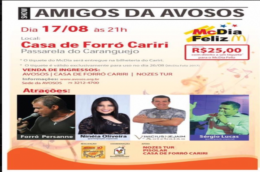 Shows Quem adquirir o ingresso, que custa R$ 25,00, além de colaborar com a campanha McDia Feliz 2017, poderá se divertir com a programação musical dos renomados parceiros da Avosos: Vinicius Nejaim & Xote Baião, Ninéia Oliveira, Sérgio Lucas, Persanne e participação dos dançarinos Gabrielly & Sidney (Academia Siga Dancing).