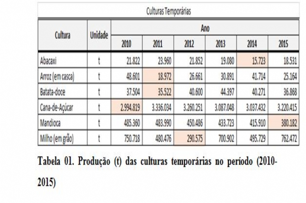 A produção do abacaxi sofreu pouca variação no período, com redução da produção a partir de 2011 e leve recuperação em 2015. A cultura do arroz apresentou dois momentos de queda na produção (2011 e 2015) e dois anos com maior produção (2010 e 2014). A produção da batata-doce sofreu pouca variação no período. Cana-de-açúcar – pico de produção em 2011, queda até 2014, recuperando-se em 2015. Mandioca – cultivo tradicional, apresentando queda na produção desde 2011. Milho – cultivo tradicional, totalmente dependente de chuvas, teve três anos de queda (2011, 2012 e 2015)
