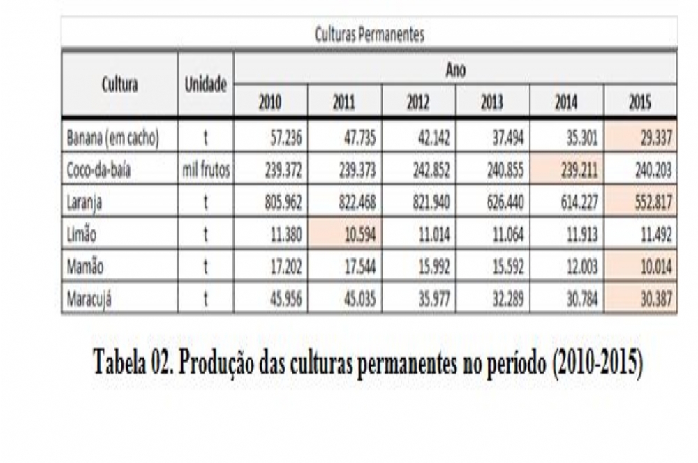 Na Tabela 02 destacamos os anos em que houve maior declínio na produção para o período de (2010-2015).