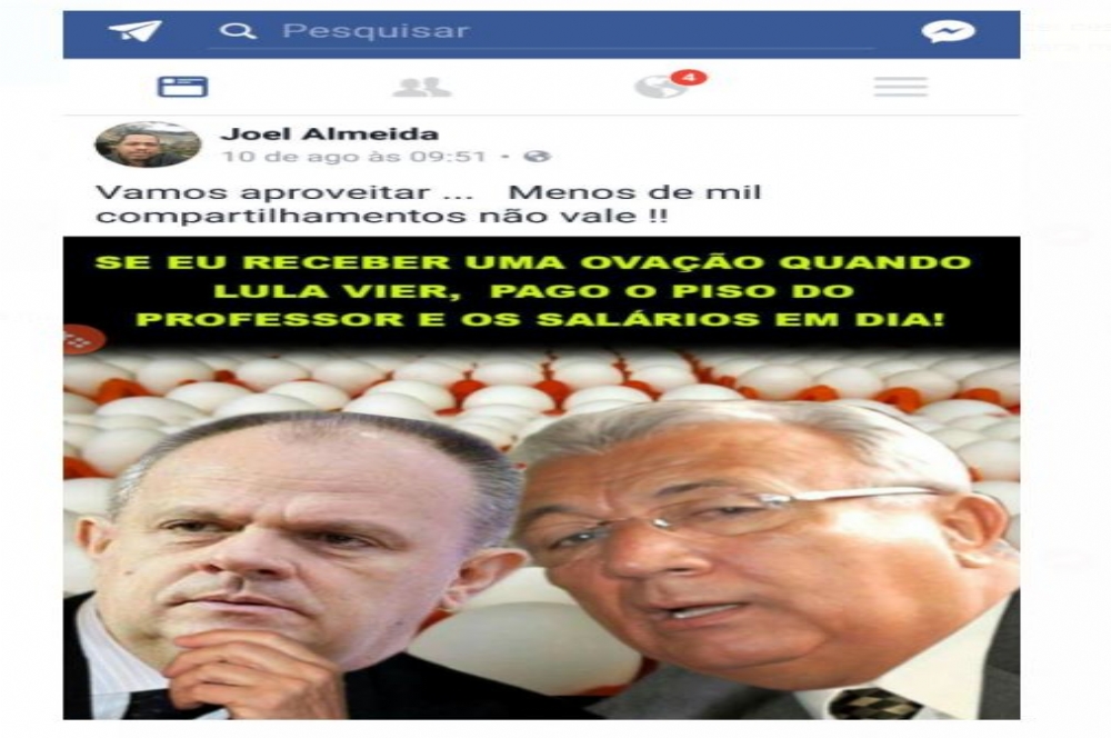 postar uma foto de Jackson e Beivaldo tendo ao fundo centenas de ovos com o título “Se eu receber uma ovação quando Lula vier pago o piso do professor e os salários em dia!”