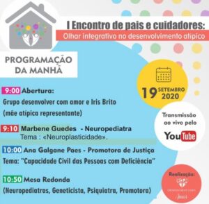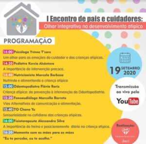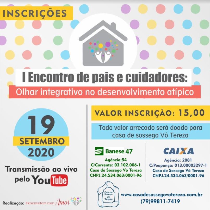 I Encontro e pais e cuidadores: olhar integrativo no desenvolvimento atípico Numa realização do grupo Desenvolver com Amor, será realizado no dia 19 de setembro o I Encontro e pais e cuidadores: olhar integrativo no desenvolvimento através do canal no Youtube. O valor da inscrição será de apenas R$ 15,00 e toda renda será revertida para a casa de Sossego Vó Tereza. Segundo a organização, o dia 19 de setembro será com o olhar Multidisciplinar do Desenvolvimento atípico destinados para pais e cuidadores. Um momento dedicado para eles, a base de amor, dedicação e de extrema importância em toda caminhada. Até lá este espaço vai contribuir com a divulgação e novas informações.