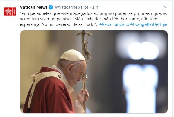 www.twitter.com/vaticannews_pt “Porque aqueles que vivem apegados ao próprio poder, às próprias riquezas, acreditam viver no paraíso. Estão fechados, não têm horizonte, não têm esperança. No fim deverão deixar tudo”. #PapaFrancisco #EvangelhoDeHoje