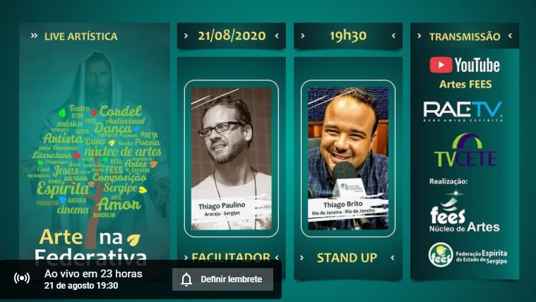 Hoje, 21/08, às 19h30h, Arte na Federativa, com Thiago Brito/RJ e Thiago Paulino/SE.No canal do youtube Artes FEES: https://youtu.be/MUT8AsD9Plg