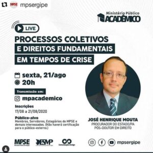 llive de hoje, 211, do “Ministério Público Acadêmico” – iniciativa da Procuradoria-Geral de Justiça, por meio da Coordenadoria de Ensino da Escola Superior do Ministério Público (ESMP) – terá como convidado o procurador do Estado do Pará e professor de Direito, José Henrique Mouta. A Live será a partir das 20h, e discutirá sobre “Processos coletivos e direitos fundamentais em tempos de crise”. O “Programa MP Acadêmico” foi pensado como instrumento complementar para divulgar as atividades institucionais e promover intercâmbio com os discentes e docentes dos cursos de Direito de Sergipe. Membros, servidores e estagiários terão direito a certificado de participação. Inscrições e orientações na matéria no site www.mpse.mp.br Transmissão no Instagram: https://www.instagram.com/mpacademico/