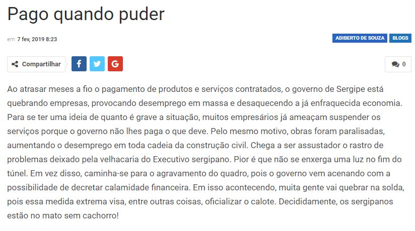 Nada como a pós-verdade eleitoral. Belivaldo que hoje tenta passar como “coitadinho” num governo em crise é o mesmo que na campanha eleitoral mostrou o governo de sucesso, um Sergipe sem problemas. A contradição é maior porque Belivaldo recebeu o governo de Jackson, um aliado que não só manteve as indicações dele como passou a pasta mais importante na área de infraestrutura para o ex-governador.
