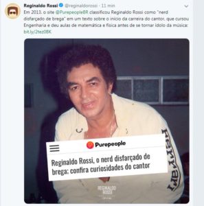 www.twitter.com/reginaldorossi Em 2013, o site @PurepeopleBR classificou Reginaldo Rossi como “nerd disfarçado de brega” em um texto sobre o início da carreira do cantor, que cursou Engenharia e deu aulas de matemática e física antes de se tornar ídolo da música. Aqui.