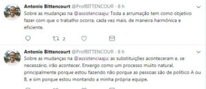Aracaju, o secretário Antônio Bittencourt postou no twitter ontem,24: “As substituições aconteceram e, se necessário, irão acontecer. Enxergo como um processo muito natural, principalmente porque estou fazendo não porque as pessoas são de político A ou B, e sim porque estou montando a minha própria equipe. Toda a arrumação tem como objetivo fazer com que o trabalho ocorra, cada vez mais, de maneira harmônica e eficiente.”