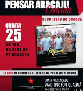 Lançamento livro O ex-prefeito e presidente estadual do PT do Rio de Janeiro, Washington Quaquá, lançará o seu novo livro no próximo dia *25 de julho em Aracaju. O lançamento acontecerá a partir das 18h na sede do PT, localizado na Avenida Barão de Maruim, 704.*O livro é intitulado como ‘Maricá: Cidade das Utopias’ e aborda toda década de governo do PT e suas políticas sociais que foram implantadas em Maricá, como a implantação da Moeda Social Mumbuca, dos ônibus tarifa zero, entre outras.