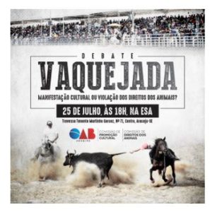 Manifestação cultural ou violação dos direitos dos animais: evento debaterá aspectos legais acerca da vaquejada A Ordem dos Advogados do Brasil, em Sergipe, através da Comissão de Promoção Cultural, realizará nesta quinta-feira, 25, um debate sobre os aspectos constitucionais acerca da vaquejada. O propósito é fazer uma reflexão sobre a prática como uma manifestação cultural ou uma violação dos direitos dos animais, analisando a prevalência entre garantias. Toda matéria aqui.