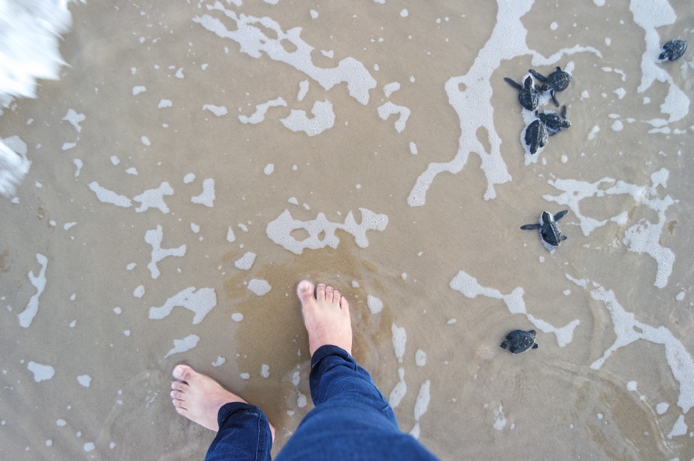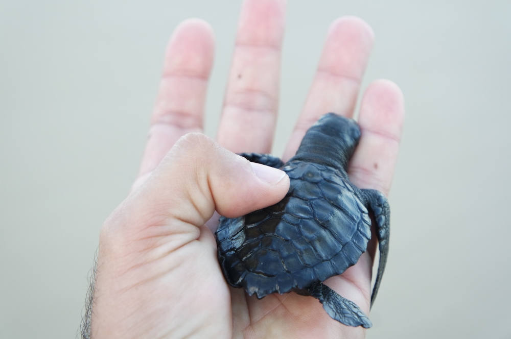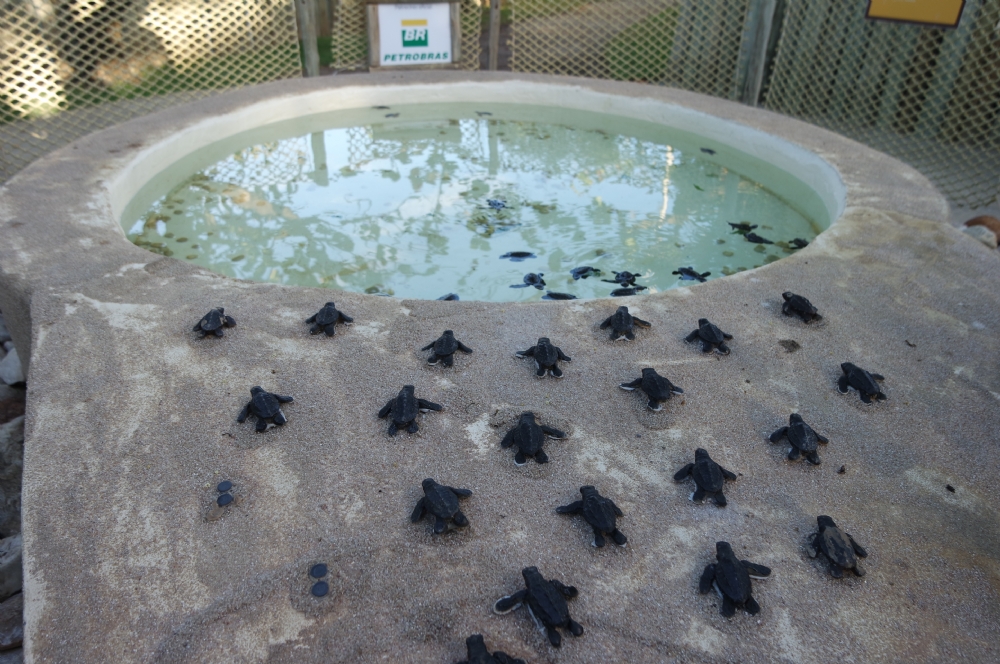 A luz natural faz com que os filhotinhos se guiem em direção a água. Muitos preferem ficar quietinhos e a ajuda da mão dos técnicos e dos visitantes são bem-vindas.