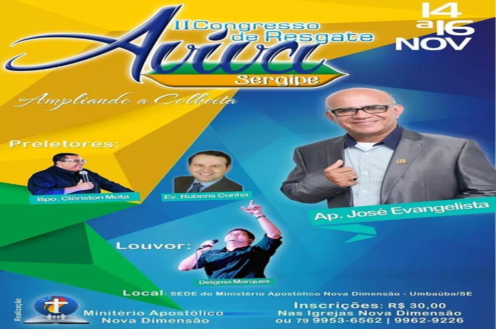 O Congresso de Resgate Aviva Sergipe chega à segunda edição nos próximos dias 14, 15 e 16 de novembro e tem como principal objetivo agregar pessoas em seguidos momentos de clamor e oração pelo estado. O evento, organizado pelo Ministério Internacional Nova Dimensão (MIND) – com sede em Umbaúba, localizada há 98km da capital – visa, também, consolidar a fé das pessoas e levá-las a desfrutar ainda mais do amor e graça de Deus. Aproximadamente 2.500 pessoas devem passar diariamente pelo local.
