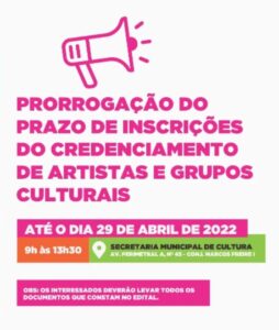 Socorro: Prefeitura reabre hoje, 22, chamamento público de apoio cultural A Prefeitura de Socorro, por meio da Secretaria Municipal de Cultura (Semcult), reabrirá nesta sexta-feira, 22, o chamamento público n° 01/2022 para o credenciamento de artistas e grupos. O processo vai até 29 de abril e é voltado para artistas, bandas, grupos musicais, culturais e folclóricos, forró pé de serra, quadrilhas juninas, orquestras, fanfarras, grupos de danças, espetáculos circenses e demais segmentos artísticos, que terão a oportunidade de apresentarem seus talentos em eventos e festividades da Prefeitura, havendo necessidade.