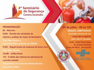 Prevenção O evento acontecerá na próxima quarta-feira, 03, das 8h às 12h, no Hotel Real Classic, fazendo parte das atividades referentes à Semana Nacional de Prevenção contra Incêndio e Pânico e será fundamental para a melhoria do atual processo de simplificação das licenças das micro e pequenas empresas. As inscrições poderão ser realizadas através do site www.cbm.se.gov.br e são gratuitas, mas limitadas.
