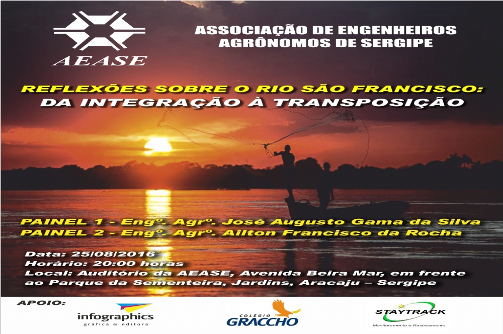 realizado pela entidade um evento técnico com palestras com o tema “Reflexões sobre o Rio São Francisco – Da Integração à Transposição”. Serão dois palestrantes: o engenheiro agrônomo José Augusto Gama da Silva e o engenheiro agrônomo Ailton Francisco da Rocha.