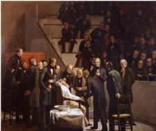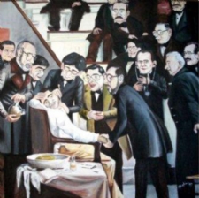 , então presidente do Sindicato dos Médicos de Sergipe. O cirurgião é Carlos Alberto Mendonça, cirurgião de cabeça e pescoço e presidente da Unimed. Monitorando-lhe o pulso do paciente o médico Lucio Prado Dias (Presidente da Academia), sob o olhar  de William Soares (Presidente da Somese). Como assistentes do ato operatório, vemos ainda Henrique Batista ( com o estetoscópio) e Atilano Godinho. Presenciam a operação os médicos Cleovansóstenes Aguiar, Saulo Maia, Josias Passos e João Alberto, além do Sr. Aloísio (secretário da Somese) e o próprio artista Belém, no topo da figura, cortado pela metade. A seleção do paciente não foi difícil. O funcionário mais antigo da Somese, Gileno dos Santos, sofria naquela oportunidade de um cisto do tireoglosso e ele foi escolhido para representar o paciente sendo operado, na versão de Belém.