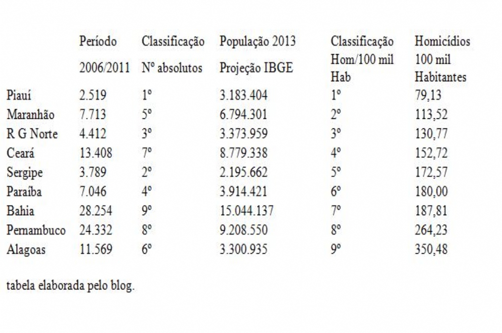 homicídios. Ele apresenta números absolutos, classificando Sergipe no segundo lugar entre os estados que menos cometeram homicídios no período de 2006 a 2011, mas quando agregamos a estes dados a população dos estados do nordeste, calculando o número de homicídios por 100 mil habitantes, cai para o 5º lugar, ou seja, Sergipe ainda comete mais homicídios que Piuaí, Maranhão, Rio Grande do Norte e Ceará.Os números populacionais são do site do IBGE (http://www.ibge.gov.br ) com projeção para o ano de 2013.