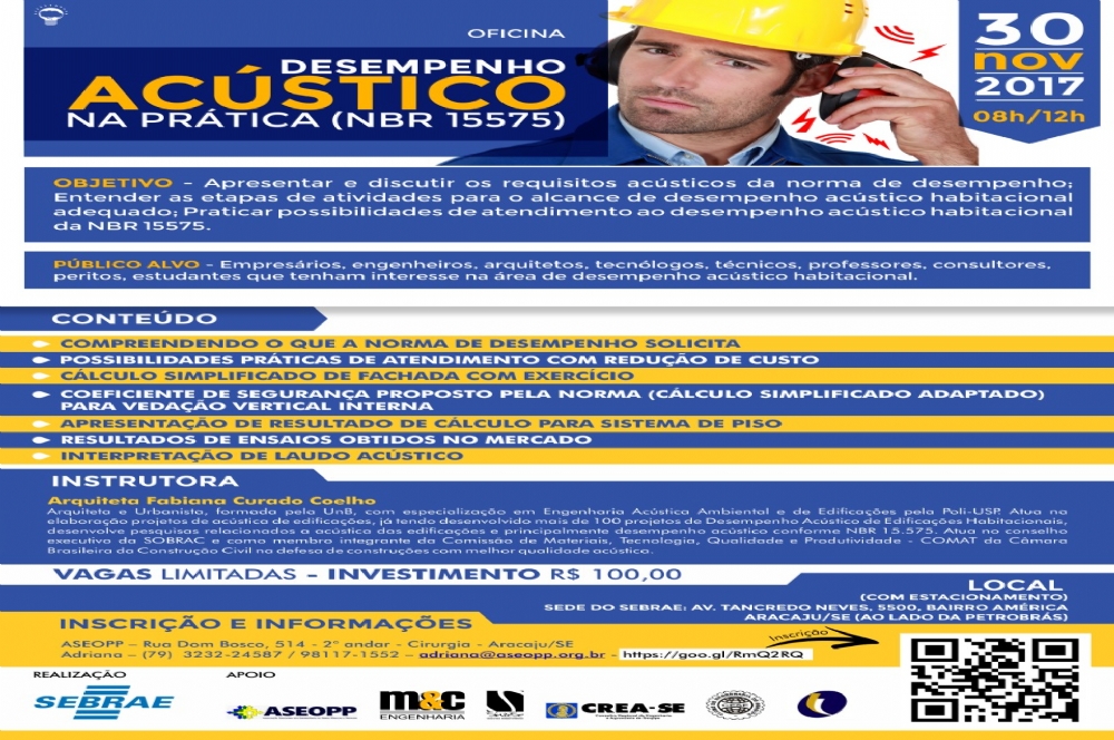 Oficina desempenho acústico na prática (NBR 15575) O Sebrae de Sergipe com o apoio de diversas entidades, entre elas a ASEOPP, o CREA-SE, Clube de Engenharia, M&C, entre outros, realizará no dia 30 de novembro das 8h às 12h, a oficina “Desempenho acústico na prática” (NBR 15575). A oficina será realizada na sede do Sebrae em Aracaju e tem um amplo conteúdo conforme o print ao lado. Valor do investimento R$ 100,00. Inscrição e informações: (79) 3232 – 24587 / 98117- 1552 ou pelo e-mail:http://Adriana@aseopp.org.br