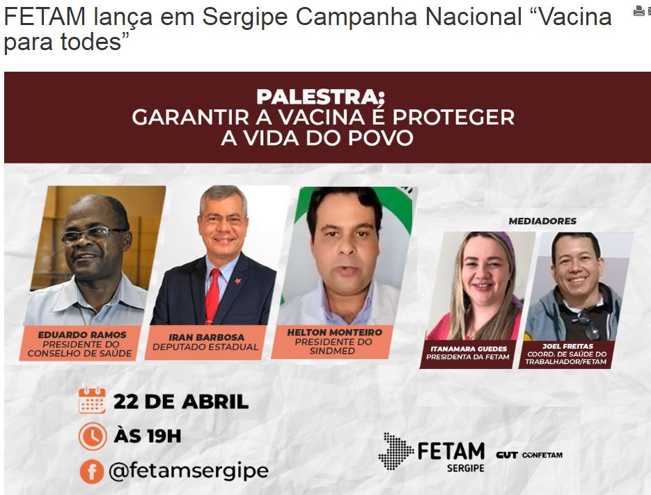 A Federação Dos Trabalhadores do Serviço Público Municipal (FETAM) realiza, nesta quinta-feira, uma palestra virtual no formato de Live, com o tema “Garantir a vacina é proteger a vida do povo”. A transmissão acontece hoje, 22, às 19h e será feita pelo facebook da FETAM Sergipe. O evento marca o lançamento, em Sergipe, da Campanha Nacional “Vacina para todes”, encampada e articulada pela Confederação dos Trabalhadores no Serviço Público Municipal (Confetam/CUT).