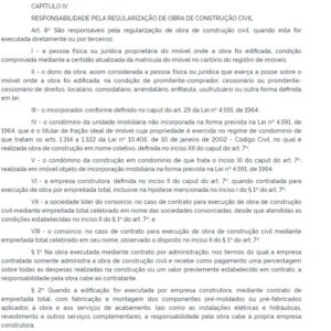 regularização de obra da construção civil. Como por exemplo esses incisos: III – o incorporador, conforme definido no caput do art. 29 da Lei nº 4.591, de 1964; IV – o condômino da unidade imobiliária não incorporada na forma prevista na Lei nº 4.591, de 1964, que é o titular de fração ideal de imóvel cuja propriedade é exercida no regime de condomínio de que tratam os arts. 1.314 a 1.322 da Lei nº 10.406, de 10 de janeiro de 2002 – Código Civil, no qual é realizada obra de construção em nome coletivo, definida no inciso XII do caput do art. 7º; V – o condômino da construção em condomínio de que trata o inciso XI do caput do art. 7º, realizada em imóvel objeto de incorporação imobiliária na forma prevista na Lei nº 4.591, de 1964; VII – a sociedade líder do consórcio, no caso de contrato para execução de obra de construção civil mediante empreitada total celebrado em nome das sociedades consorciadas, desde que atendidas as condições estabelecidas no inciso II do § 1º do art. 7º; e VIII – o consórcio, no caso de contrato para execução de obra de construção civil mediante empreitada total celebrado em seu nome, observado o disposto no inciso II do § 1º do art. 7º. § 1º Na obra executada mediante contrato por administração, nos termos do qual a empresa contratada somente administra a obra de construção civil e recebe como pagamento uma percentagem sobre todas as despesas realizadas na construção ou um valor previamente estabelecido em contrato, a responsabilidade pela obra cabe ao contratante.