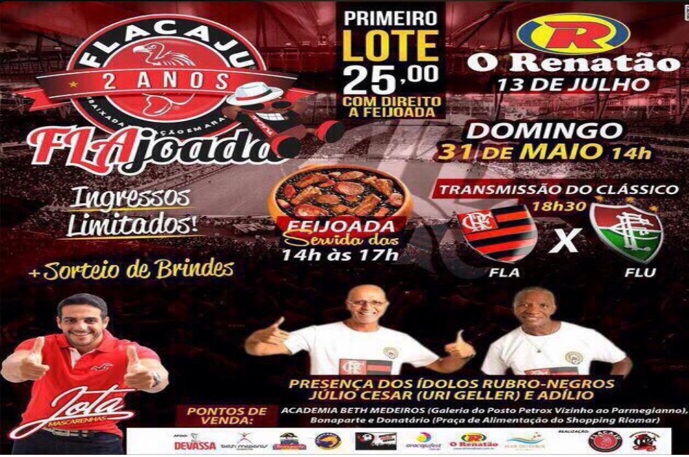 Será no dia 31 de maio, a partir das 14h, no restaurante Renatão da 13 de Julho. Além do direito a feijoada e ao show de Jota Mascarenhas os flamenguistas terão as companhias dos ídolos rubro-negro, Julio César e Adílio e sorteio de brindes. Pontos de venda: Academia Beth Medeiros (Galeria do Posto Petrox – Vizinho ao Parmegianno);Restaurante Bonaparte e Restaurante Donatário (Praça de Alimentação do Shopping Riomar).A feijoada será servida das 14h às 17h.Transmissão do clássico (Flamengo X Fluminense), a partir das 18:30h.Cerveja Devassa no valor de R$ 5,50. Informações: Thalita Coutinho – (79)9937-6367;Wilson Mendonça – (79)9837-7755 e Vitor Déda – (79)9988-3328.