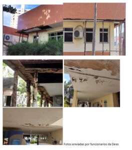 Deso sucateada e caindo aos pedaços As fotos e o vídeo foram enviados por funcionários da Deso que estão apreensivos com a situação do local na sede da Deso na Rua Campo do Brito onde tem um caixa eletrônico. Realmente é deprimente para os funcionários a atual situação da empresa. Nota-se que os caibros que estão segurando a estrutura estão cheios de cupins. Um dos vídeos recebidos pelo blog: