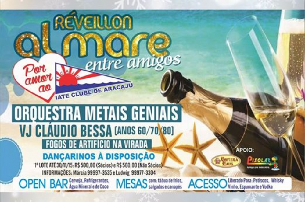 outros gêneros musicais) e o VJ Cláudio Bessa" com o melhor dos anos 60/70 e 80 em quatro telões. Temos o melhor preço dentre os Réveillons da cidade, é só conferir, além de ser o Clube melhor centralizado. Teremos Open Bar(incluso) com: Cervejas, Refrigerantes, Água de Coco e Água Mineral. Todas as mesas terão direito a uma tábua de frios com Canapés e Salgados. Na virada do ano teremos queima de fogos de artifício e dançarinos à disposição. Você poderá levar seus petiscos e sua bebida. A festa é sua e nós forneceremos toda a estrutura. Mesas à venda no Iate clube. Informações: 3211-9623/(79) 99977-3304 / (79) 99997-3535. Organização: Ludwig Oliveira e Márcia Santana Brasil. Vá lá e adquira logo sua mesa, pois depois teremos um segundo lote com preços diferenciados.