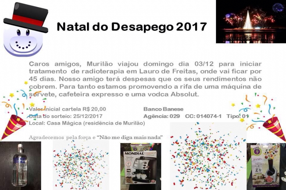 Natal do Desapego 2017 Amigos e familiares de Murilo Prado Smith, professor de História e ex-diretor do Colégio Dom Luciano se reuniram para ajudá-lo no tratamento de radioterapia que iniciou em Lauro de Freitas (BA). Para isso estão promovendo uma rifa com máquina de sorvete, cafeteira expresso e uma vodka absolut. O sorteio será dia 25 de dezembro, na Casa Mágica (Rua H, número 100, no Bairro Aruana) A cartela custa apenas R$ 20,00. Para quem quiser ajudar; Banese, agência 029; tipo 01 C/C: 014074-1.