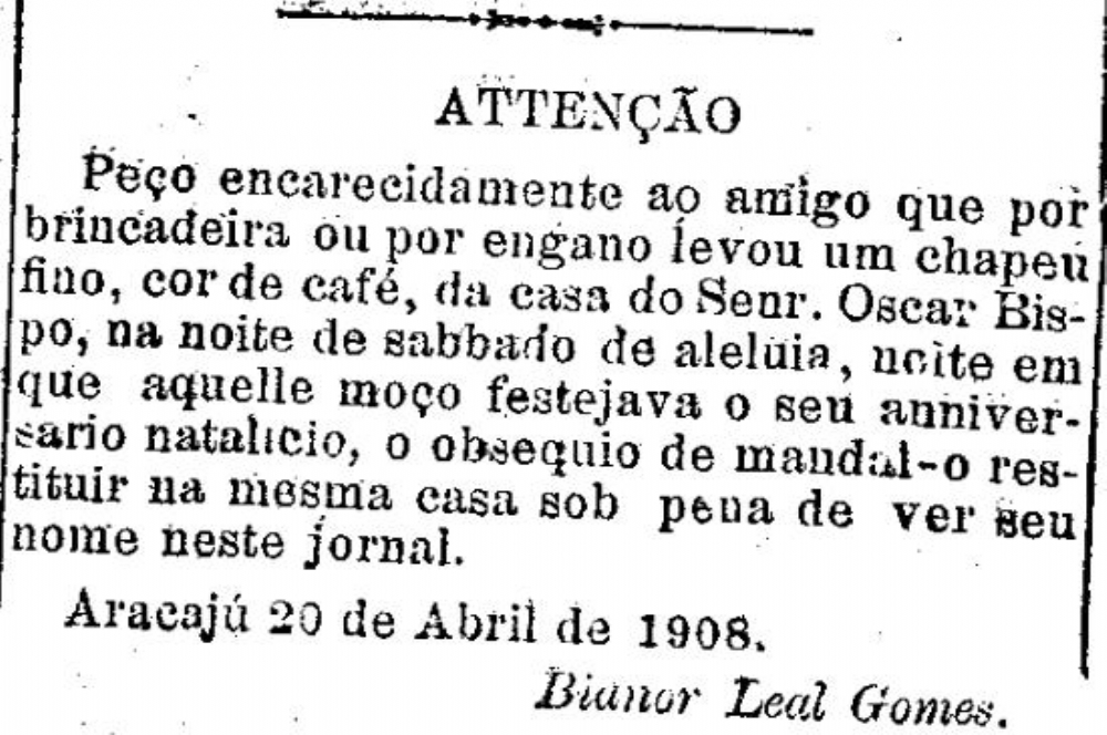 | Publicado no jornal aracajuano Folha de Sergipe em 23 de abril de 1908 |