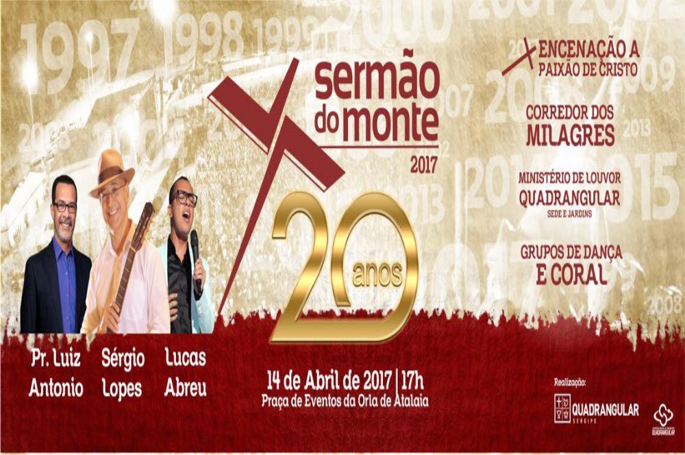 A Igreja do Evangelho Quadrangular de Sergipe realizará dia 14 de abril, às 17h, na Praça de Eventos da Orla de Atalaia, o “Sermão do Monte 2017 – 20 Anos”. O evento, cuja entrada é franca, faz parte do calendário oficial do Estado na Semana Santa, e deve reunir mais uma vez milhares de pessoas para refletirem sobre o amor de Criador para com a humanidade, através da morte de Jesus Cristo, e celebrarem a Sua ressurreição.