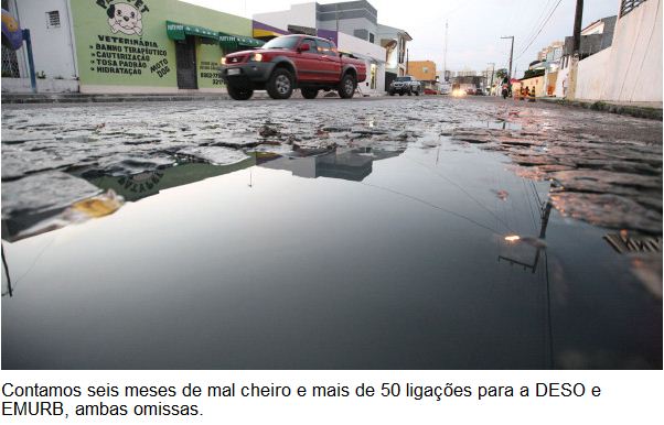 um problema existente no cruzamento das ruas Dr. Manoel Candido Pereira e Padre Caldas, bairro Luzia, em frente ao Condomínio Solar dos Cajueiros. “Contamos seis meses de mal cheiro e mais de 50 ligações para a Deso e Emurb, ambas omissas”, desabafou. O local tem várias lojas de pequeno porte que estão perdendo a clientela por conta do mal cheiro. É lamentável o total desrespeito com o cidadão que paga seus impostos. Ao lado a foto do descaso.