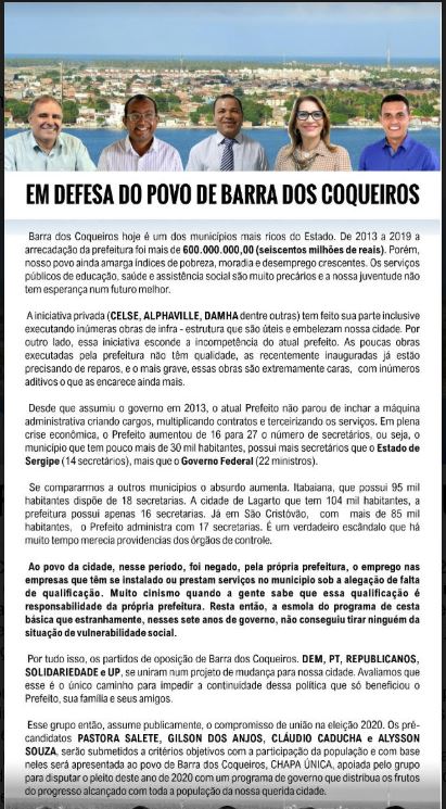 BARRA DOS COQUEIROS:; OPOSIÇÃO UNIDA DIVULGA MANIFFESTO