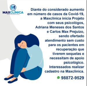 Em Aracaju, clínica disponibiliza atendimento sem custo para pacientes em recuperação da Covid-19 que necessitam de apoio psicológico Uma iniciativa que pode servir de exemplo para todo o país. A Maxclínica, localizada no conjunto Augusto Franco, Bairro Farolândia em Aracaju, diante do aumento excessivo de casos de coronavírus, iniciou um projeto ofertando sem custo o atendimento psicológico. O projeto tem à frente os psicólogos da Maxclínica, Adriana Meneses dos Santos e Carlos Max Prejuízo. A ideia surgiu depois que as pesquisas estão mostrando que muitos pacientes que se recuperaram da Covid-19 ficaram com algumas sequelas e necessitam de apoio psicológico para retomarem a vida diária. Quem se interessar é só realizar o cadastro na Maxclínica pelo whatsApp: 79 98872 – 9529.
