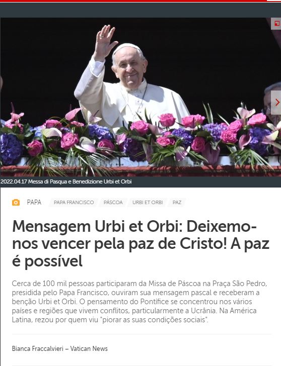 Toda mensagem aqui:https://www.vaticannews.va/pt/papa/news/2022-04/papa-francisco-missa-pascoa-urbi-orbi-paz-cristo-possivel.html